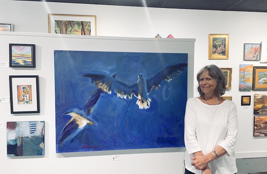 In “Color Theory,” artists were invited to focus on a specific color or combination, “creating works that explore the emotional and psychological impacts of color.” This gave me the impetus to finish “Evening Blues,” a 36″ x 48″ acrylic on canvas that features the very blue domain of my good friends, the seagulls.