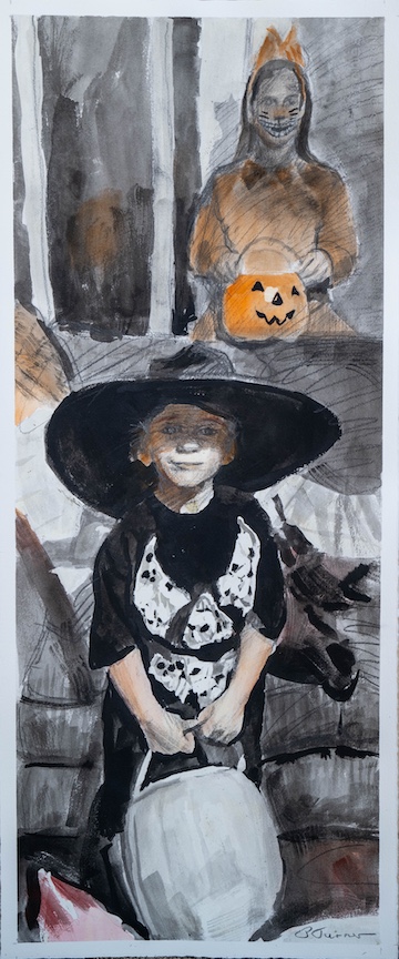 “The Night Begins” commemorates an October photo op with Richard’s grandchildren, just before they headed into the darkness of a Jacksonville, Fla., suburb. India ink, gouache, and graphite on paper, 20″ x 8″ unframed.